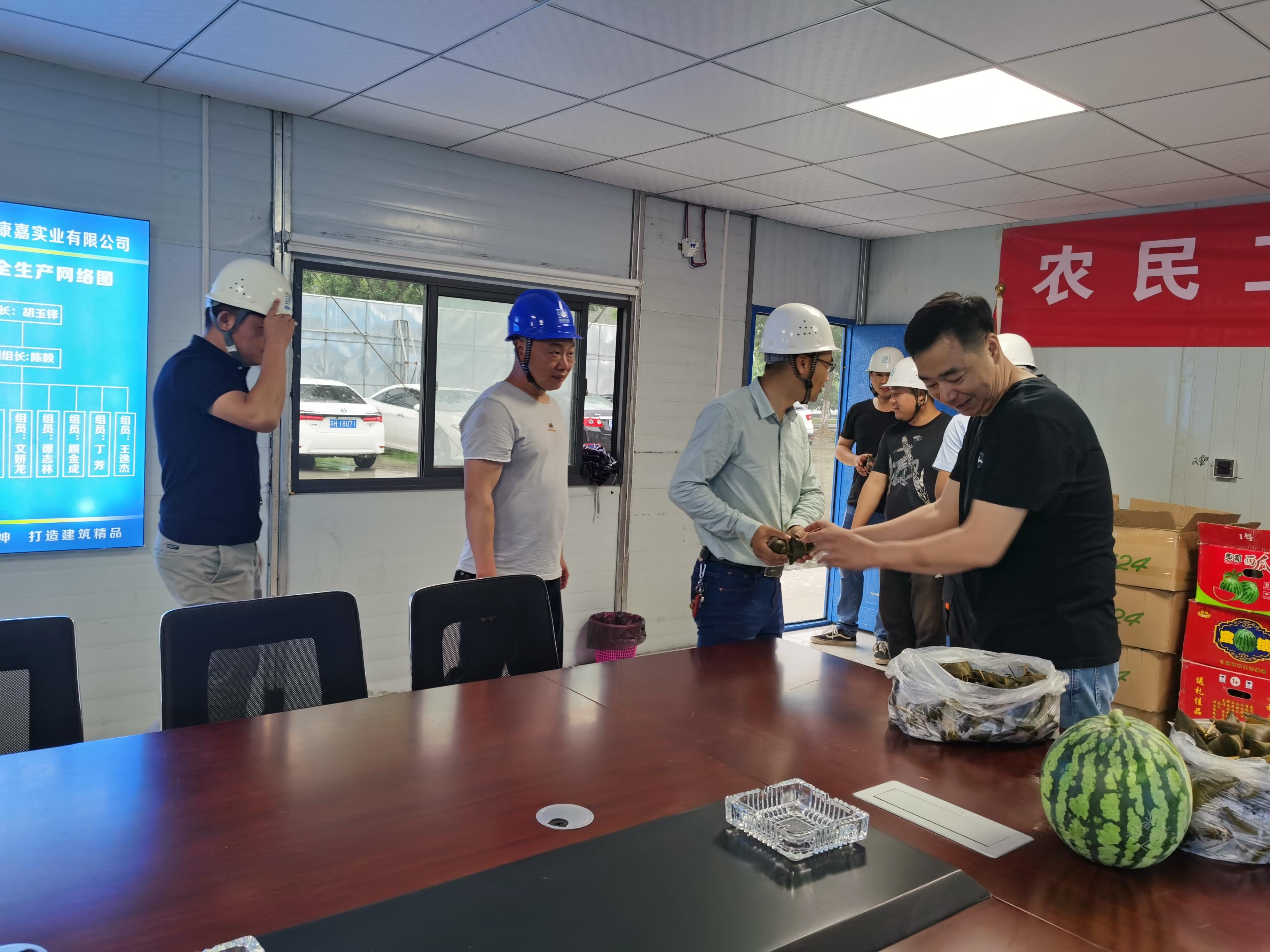 活動現(xiàn)場,公司領導班子給項目一線員工分發(fā)粽子、西瓜,項目部飄散著陣陣粽子香,洋溢著濃濃的節(jié)日氣氛,現(xiàn)場充滿歡聲笑語,此刻大家暫時放下手中繁忙的工作,相聚在一起,共享節(jié)日的喜悅。