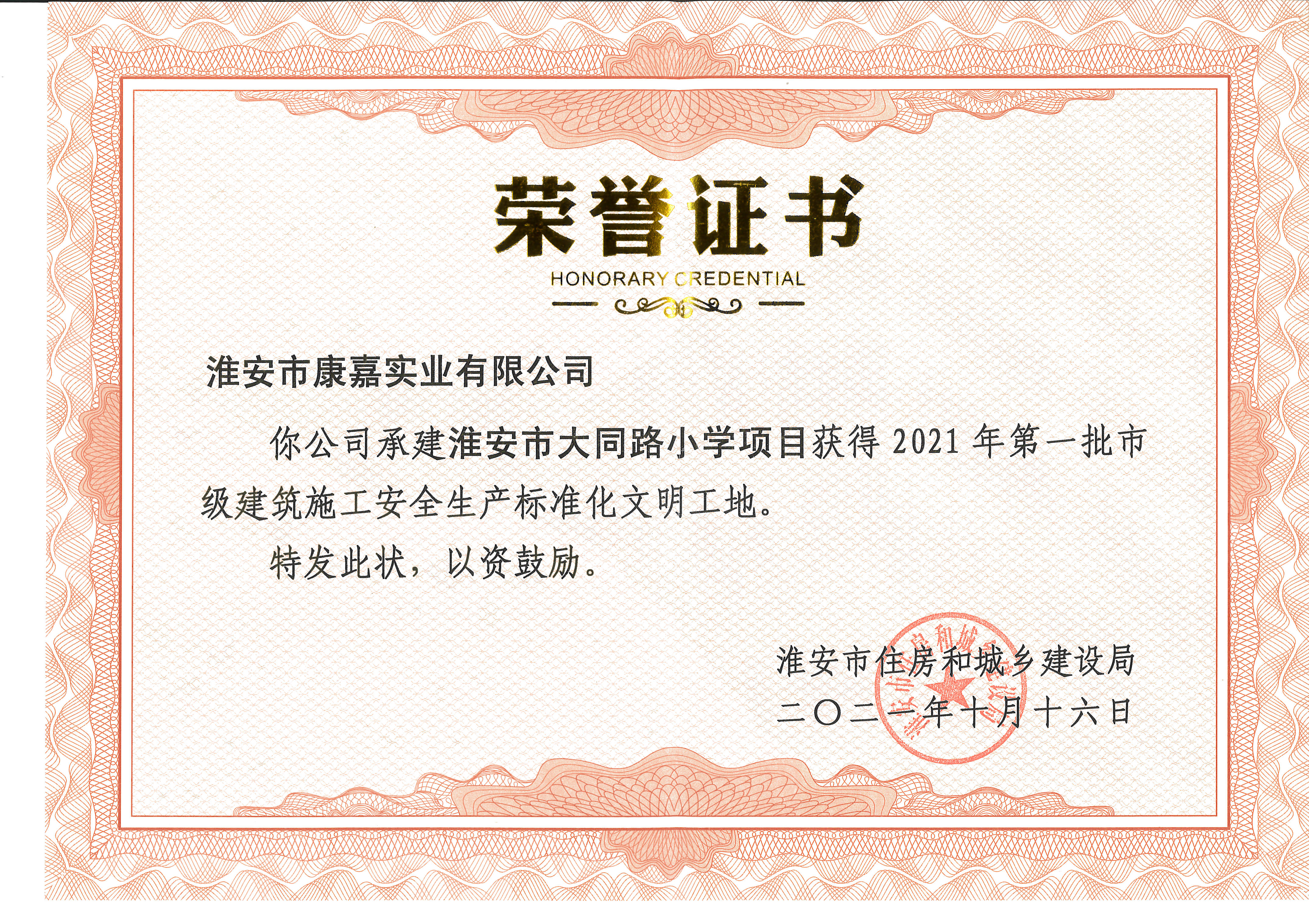 近日,2021年淮安市第一批市級(jí)建筑施工安全生產(chǎn)標(biāo)準(zhǔn)化文明工地項(xiàng)目名單揭曉,康嘉實(shí)業(yè)公司承建的淮安市大同路小學(xué)及東湖嘉景商住二期A-10、C-10、地下室(二)工程兩個(gè)項(xiàng)目榮獲市級(jí)標(biāo)化工地稱號(hào)。